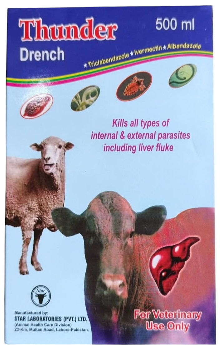 Thunder Drench is a triple-action, broad-spectrum oral dewormer for livestock (cattle, sheep, goats, and camels) containing Triclabendazole, Ivermectin, and Albendazole. It treats and controls gastrointestinal roundworms, liver flukes, tapeworms, lungworms, and external parasites like lice and mites. It boosts livestock health, growth, and feed